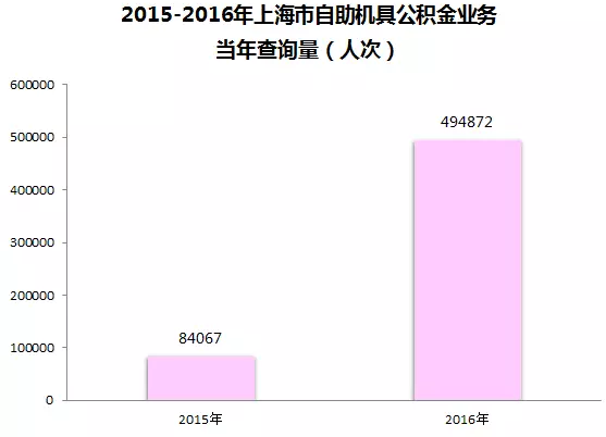 4.增加自助机具数量,免去职工柜面办理业务所需的排队等候时间。自2015年起,上海市住房公积金管理部门与本市多家商业银行开展合作推出自助机具查询公积金服务,2016年又在各区管理部和徐汇区行政服务中心增设自助查询设备,大大方便群众,社会反响良好。全市自助机具住房公积金业务当年查询量从2015年的84067人次增加到2016年的494872人次,上升了488.66%。