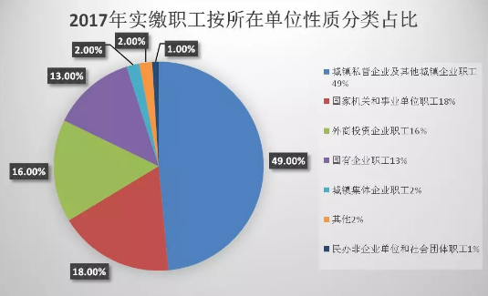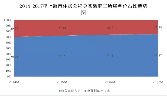 近年来,越来越多的民营经济、外资经济企业高度重视国家法规的执行,重视住房公积金对人才的吸引力,积极为职工缴存住房公积金,保障职工权益,为本企业留住人才,也增强了企业的竞争力。从实缴职工所在单位性质看,2017年公有制单位(含国家机关和事业单位、国有企业、城镇集体企业)实缴职工数占实缴职工总数的25.13%,非公企业(含外商投资企业、城镇私营企业及其他城镇企业、民办非企业单位和社会团体等)实缴职工数则高达74.87%。