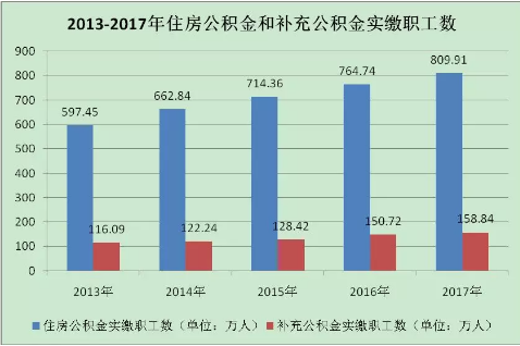 同时,越来越多的职工参与到住房公积金和补充住房公积金中。本市住房公积金实缴人数从2013年的597.45万人增加到2017年的809.91万人,五年内增加了212.46万人,上升幅度为35.56%;补充住房公积金实缴人数从2013年的116.09万人增加到2017年的158.84万人,五年内增加了42.75万人,上升幅度为36.82%。