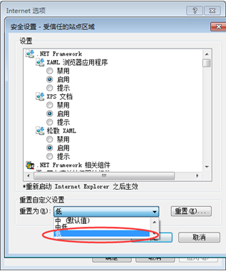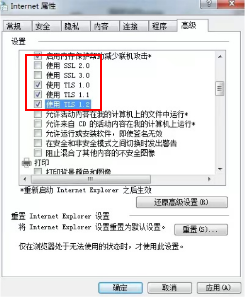 1) 进入浏览器页面 —>工具 —>internet选项 ![]() 2) 选择安全 —>点击可信站点 —>点击站点,添加以下网址: https://*.shzfgjj.cn ![]() 3) 点击上图中自定义级别,进入下图,将自定义设置改为“低”。 ![]() 4) 在IE选项->高级标签中,按红框所框出的内容修改设置。推荐优先使用TLS1.2,如因操作系统无TLS1.2的,建议使用TLS1.0和TLS1.1尝试。 ![]() |