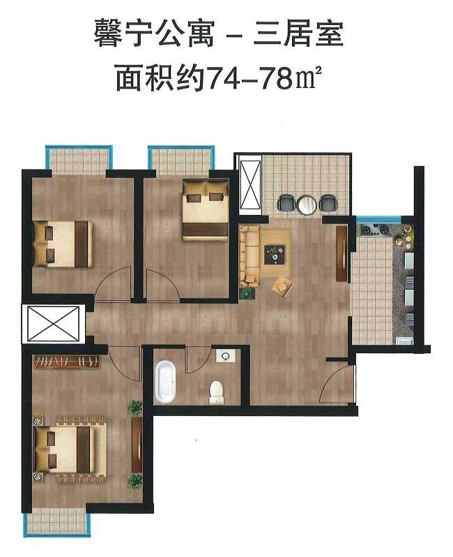 三居室房型平面效果(室内装修配置以实际情况为准)