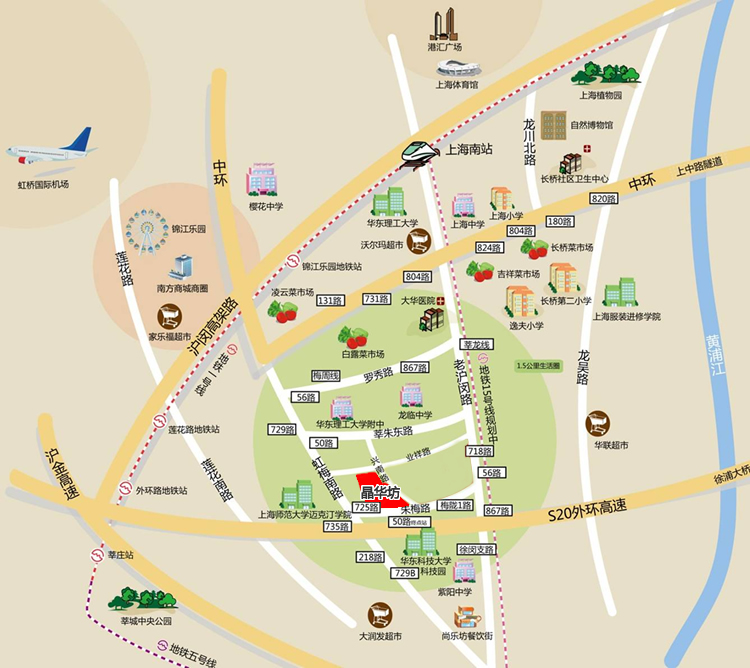 该项目靠近外环线虹梅南路下匝道附近,地理位置较为优越。周边有50路、152路、718路等多条公交线路可到达闵行区和徐汇区各个方向,至轨道交通15号线朱梅路站只需10分钟左右。