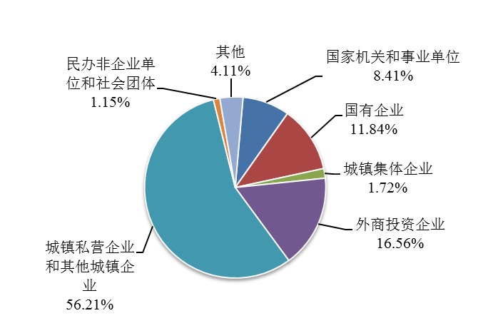 缴存单位中,国家机关和事业单位占2.32%,国有企业占1.88%,城镇集体企业占0.94%,外商投资企业占5.99%,城镇私营企业及其他城镇企业占87.20%,民办非企业单位和社会团体占0.70%,其他占0.97%。