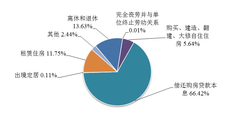 提取金额中,住房消费提取占83.81%(偿还购房贷款本息占66.42%,租赁住房占11.75%,购买、建造、翻建、大修自住住房占5.64%,其他占0.00%);非住房消费提取占16.19%(离休和退休提取占13.63%,完全丧失劳动能力并与单位终止劳动关系提取占0.01%,出境定居占0.11%,其他占2.44%)。