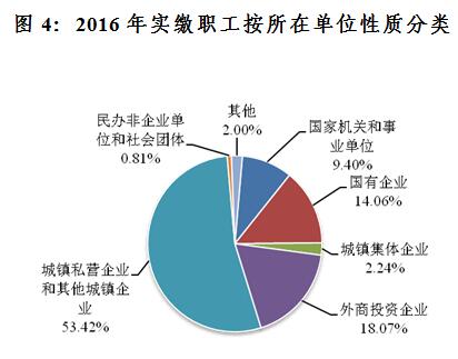 缴存职工中,国家机关和事业单位占9.40%,国有企业占14.06%,城镇集体企业占2.24%,外商投资企业占18.07%,城镇私营企业及其他城镇企业占53.42%,民办非企业单位和社会团体占0.81%,其他占2.00%。