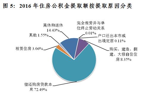 提取的金额中,住房消费提取占83.91%(偿还购房贷款本息占72.49%,购买、建造、翻建、大修自住住房占8.35%,租赁住房占3.06%,其他占0.01%);非住房消费提取占16.09%(离休和退休占14.43%,完全丧失劳动能力并与单位终止劳动关系占0.01%,户口迁出本市或出境定居占0.11%,其他占1.54%)。