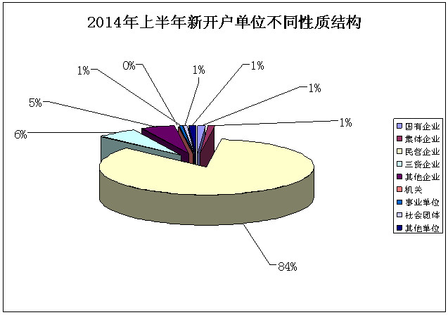 上半年新开户单位数为2.3万,增幅高于同期。主要特点:一是民营企业开户增速加快。上半年新开户民营企业为19357户,同比增幅9.36%,比近三年的平均增幅高2个百分点,保持较快增长趋势。上半年新开户单位中,民营企业占比为84%,在当年新开户各类单位中占比最高,其次是三资企业,占比为6%,两类单位共占新开户单位的90%。2014年上半年新开户单位不同性质结构如下图: