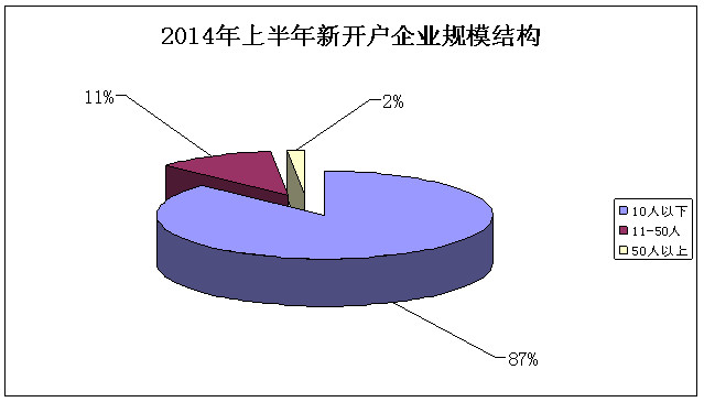 二是小微企业在新开户企业中占比最高。对新开户单位进一步分析显示,上半年新开户企业中,职工数在10人及以下的小微企业比例为87%,占新开户企业的近九成。11至50人的企业比例为11%。小微企业开户的快速增长使其成为本市住房公积金缴存单位数持续增长的主要增长点。2014年上半年新开户企业不同规模结构情况如下图: