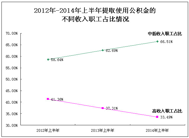 2012年-2014年上半年提取使用公积金的不同收入职工占比情况如下图: