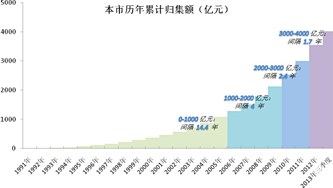 截至三季度末,本市住房公积金累计归集额突破4000亿元,达到4016亿元。近年来,住房公积金归集额始终保持良好增长,归集千亿元资金的时间逐渐缩短。统计数据显示,从1991年建立住房公积金制度起,累计归集额实现0-1000亿元、1000-2000亿元、2000-3000亿元、3000-4000亿元的时间分别为14.4年、4年、2.4年、1.7年。本市住房公积金历年累计归集额见下图: