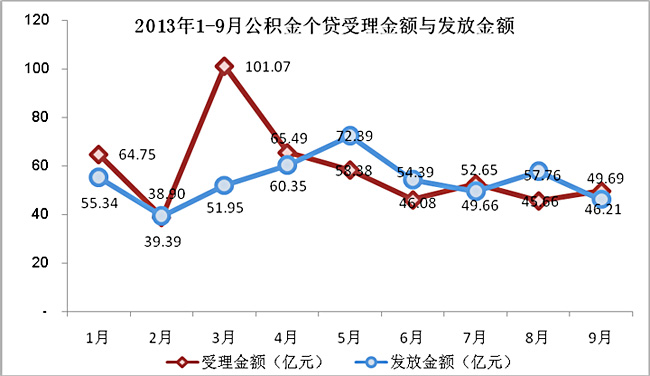 三季度,受本市住宅成交季节性规律等因素影响,本市住宅成交量同比上升,但环比二季度有所下降。受此影响,三季度公积金个贷的需求环比减少,受理金额为148亿元,分别比一、二季度下降了56.72亿元、21.95亿元。相应地,三季度公积金个贷发放金额亦平稳回落,季度累计放款153.63亿元,较二季度减少了33.50亿元,降幅约17.9%。2013年1-9月公积金个贷受理金额与发放金额见下图: