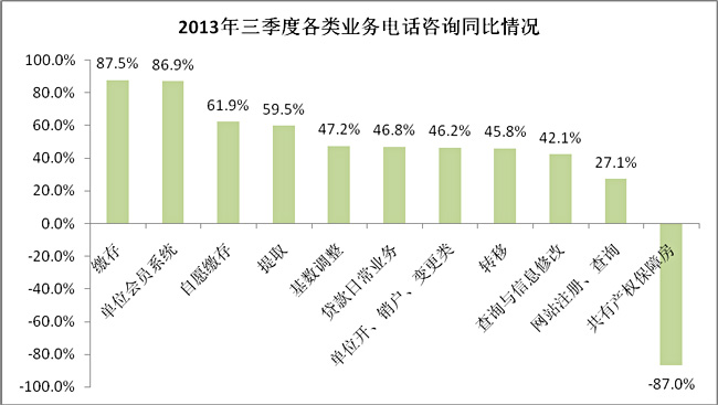 随着住房公积金制度覆盖面的扩大,缴存职工了解和维护自身住房公积金权益的需求和意识日益增强。为了适应和满足缴存职工查询住房公积金账户情况、了解和咨询住房公积金业务办理相关信息的需求,市公积金中心全力打造多样化便民服务平台。三季度新开通了上海公积金微博新浪和腾讯平台,手机客户端全新改版上线,新增了纯公积金贷款办理进度网上查询功能,12329住房公积金热线增加了接听线路和服务人员。四项便民服务措施相互补充,联动互通,为广大群众了解住房公积金制度,咨询办理相关业务以及查询账户等提供了更为便捷的服务。三季度,市公积金中心发布微博信息465条;手机客户端登录使用100.1万人次,同比增长408%;网站个人账户查询达484.7万人次,同比增长51%;12329热线电话接听总量达到48.2万个,同比增长56%。下图为2013年三季度各类业务电话咨询同比情况: