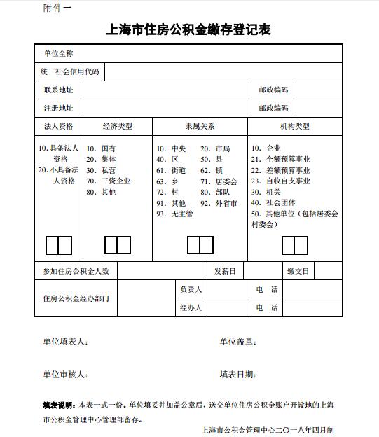 单位提供填妥并加盖单位公章的《上海市住房公积金缴存登记表》(附件1)至管理部办理。各管理部录入统一社会信用代码,系统读取单位相关法人信息。