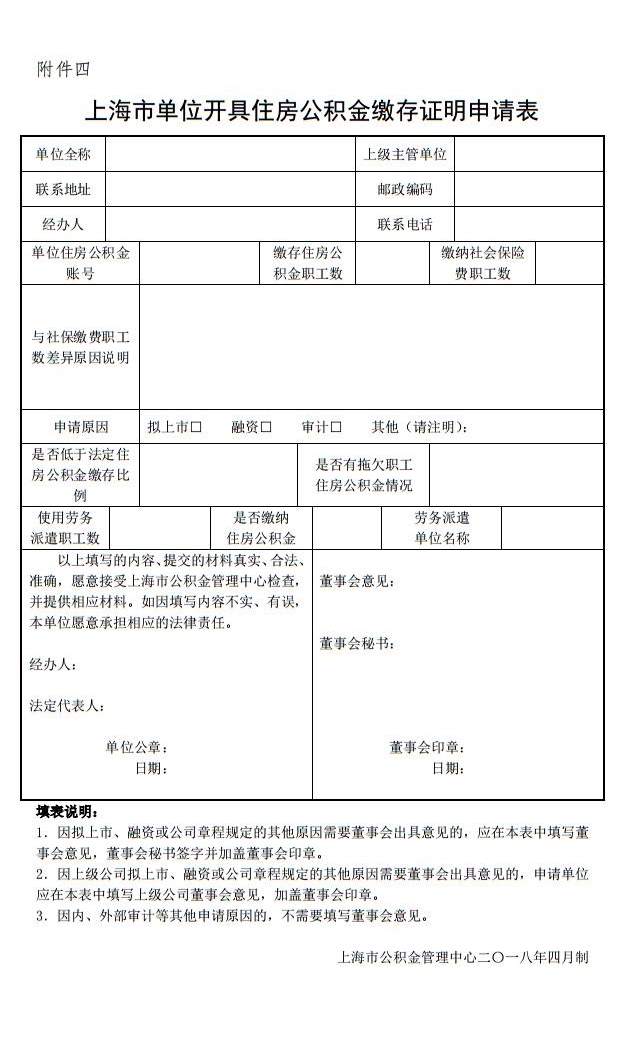 2.填妥并加盖单位公章的《上海市单位开具住房公积金缴存证明申请表》(附件4)。因上市、融资等法规或者公司章程规定的需要董事会出具意见的,应当加盖董事会印章。