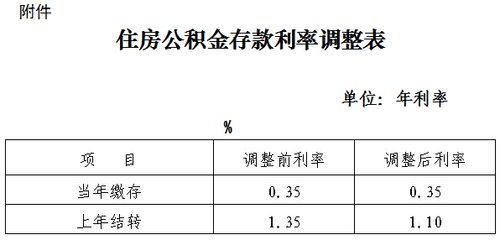 从2015年10月24日起,下调个人住房公积金存款利率。当年归集的个人住房公积金存款利率不变,仍为0.35%;上年结转的个人住房公积金存款利率由1.35%下调至1.10%。