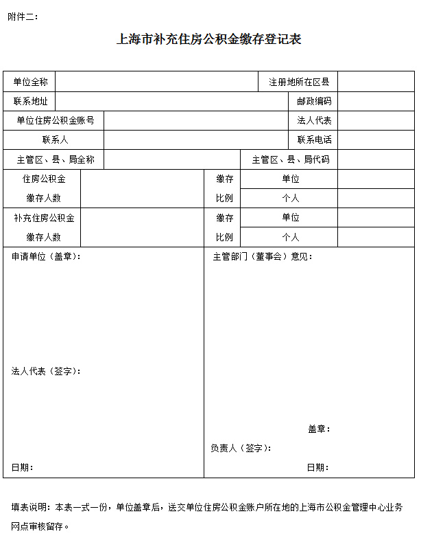 4、填妥并加盖单位公章的一联《上海市补充住房公积金缴存登记表》(附件二),如有上级主管部门还需经上级主管部门盖章批准;