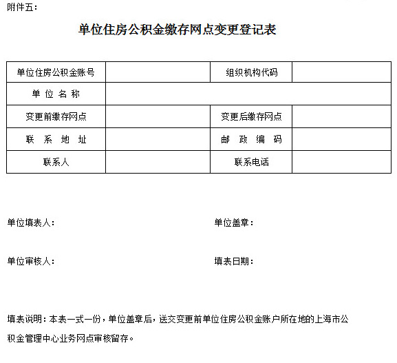 办理要件:填妥并加盖单位公章或住房公积金业务专用章的《单位住房公积金缴存网点变更登记表》(附件五)。