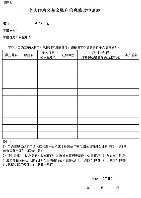 (1)填妥并加盖单位公章且经本人签字确认的《个人住房公积金账户信息修改申请表》(附件七);