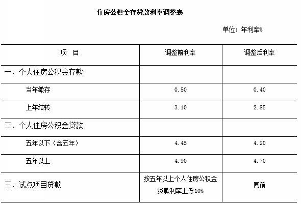 一、从2012年6月8日起,下调个人住房公积金存款利率。当年归集的个人住房公积金存款利率下调0.10个百分点,由0.50%下调至0.40%;上年结转的个人住房公积金存款利率下调0.25个百分点,由3.10%下调至2.85%。