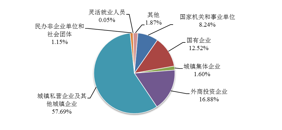 缴存职工中,国家机关和事业单位占8.24%,国有企业占12.52%,城镇集体企业占1.60%,外商投资企业占16.88%,城镇私营企业及其他城镇企业占57.69%,民办非企业单位和社会团体占1.15%,灵活就业人员占0.05%,其他占1.87%;中、低收入占92.33%,高收入占7.67%。
