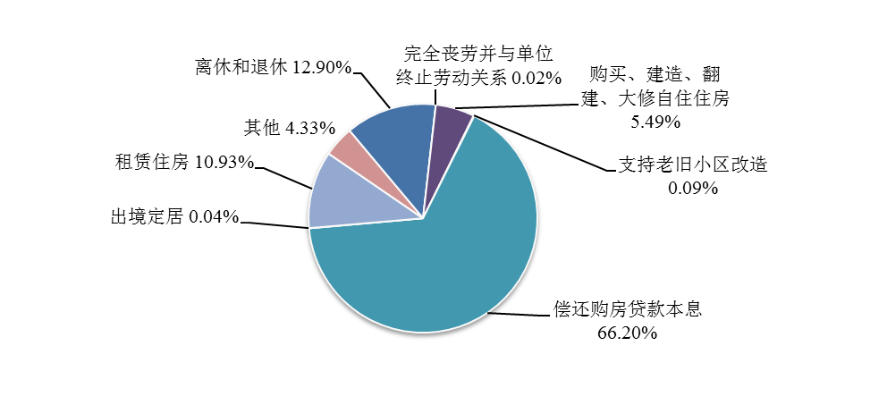 提取金额中,偿还购房贷款本息占66.20%,租赁住房占10.93%,购买、建造、翻建、大修自住住房占5.49%,支持老旧小区改造占0.09%,离休和退休提取占12.90%,完全丧失劳动能力并与单位终止劳动关系提取占0.02%,出境定居占0.04%,其他占4.33%。
